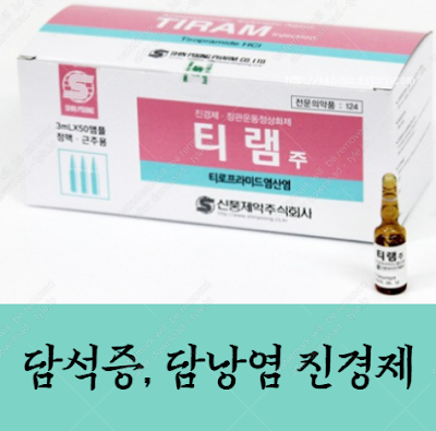 티램주 티램주는 신풍제약에서 생산중인 전문의약품으로 의사의 처방을 통하여 투약 가능한 말초신경용약의 진경제 입니다. 이 약은 갈색 앰플에 투명한 액체가 들어 있는 주사제 입니다. 성분과 효능 - 티로프라미드염산염 50mg 위 성분을 사용하여 간담도산통, 다양한 원인에 의한 복부의 산통, 신장요통, 요관 산통, 위장관 이상운동증, 담석증, 담낭염, 수술 이후 유착 등으로 인한 복부경련과 통증에 도움을 줄 수 있습니다. 산통의 보편적인 증상은 평활근의 경련과 수축으로 그 통증의 강도가 아주 심하게 간격을 두고 일정하게 밀려오는 것이 특징입니다. 진경제라는 약의 특징은 위장 근육의 과도한 수축 억제를 통하여 경련성 통증 완화에 도움을 주게 됩니다. 인간의 소화기관이나 내장 평활근의 통증이나 복통이 생기는 이유는 바로 이런 과도한 수축과 그로 인한 경련때문입니다. 오늘 알아보는 티램주 이 약은 빠르게 근육세포의 합성효소 활성화 작용으로 cAMP 농도 증가를 가져와 근육이 수축에 필요한 칼슘이온의 양 조절로 위장관의 수축력을 감소시키게 됩니다. 사용방법 근육이나 정맥에 1회 50mg을 주사하게 됩니다. 환자에 따라서 처방은 달라질 수 있습니다. 경우에 따라서는 1회 투약 이후 1시간 뒤 재투여 가능합니다. 그리고 임산부나 그 가능성이 있는 여성, 수유부의 경우는 그 사실을 진료 과정에서 반드시 알려야 합니다. 혹시 모를 사고를 미연에 방지하기 위함입니다. 주의사항 티램주의 특성상 현재 혈압약을 복용하고 있는 사람이 이 약의 과도한 용량 투약을 하게 될 경우 혈압강하 효과를 상승시킬 수 있어 주의가 요구 됩니다. 특히 아래와 같은 환자의 경우는 티램주 투약을 하지 않아야 합니다. - 거대결장 환자 - 몸이 허약하거나 기운이 없는 환자 - 녹내장환자 - 전립선 비대증 환자 - 위장관 협착환자. - 간부전이 중증인 환자 부작용 환자에 따라서 이상반응이 다르게 나타날 수 있습니다. 보통은 변비, 가려움, 구역, 구갈, 알레르기 증상을 동반할 수 있습니다. 이...